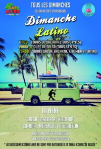 DE: Jeden Sonntag „Dimanche Latino“ im Delirium Café Kehl. Kurszeiten wie oben beschrieben ab 17.30 Uhr; ab 20 bis 1 Uhr Party.